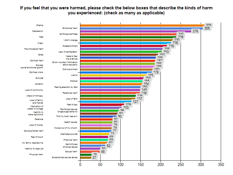 Note that the top three selections from the options which are far above the rest are Shame, Emotional Harm, and Depression. A number of written responses said they developed drug and/or alcohol abuse as a result of their ex-gay experience, sometimes with the idea that “since I was told that gay people were sinners, I was going to be the best one ever!” Also, a number of written responses made reference to their sexual development being harmed because of their ex-gay experience. Similarly, a number of the written responses acknowledge the difficulty to develop intimacy in any kind of relationship because they had been taught by their ex-gay leaders to avoid and distrust any kind of closeness in same-sex connections (sexual or otherwise).